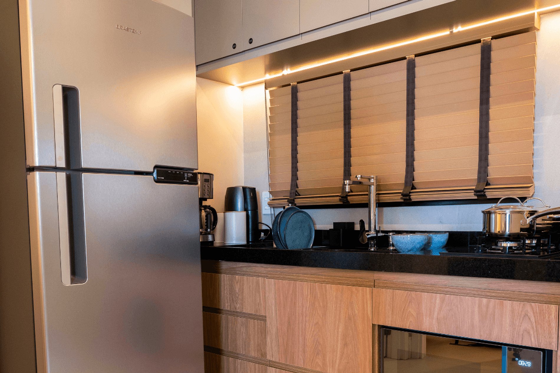 A varanda gourmet é o lugar perfeito para aproveitar momentos descontraídos, enquanto a cozinha, equipada com aparelhos modernos e utensílios premium, proporciona praticidade e prazer na hora de preparar suas refeições favoritas.