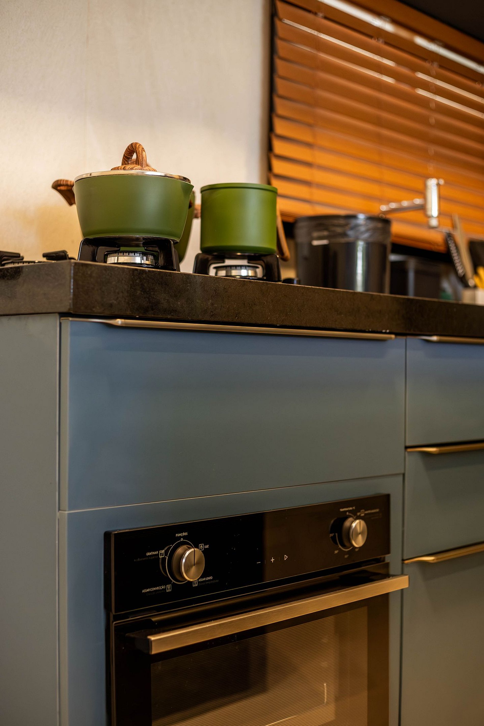 - Cozinha totalmente equipada, com fogão, micro-ondas, forno elétrico, geladeira e utensílios essenciais;