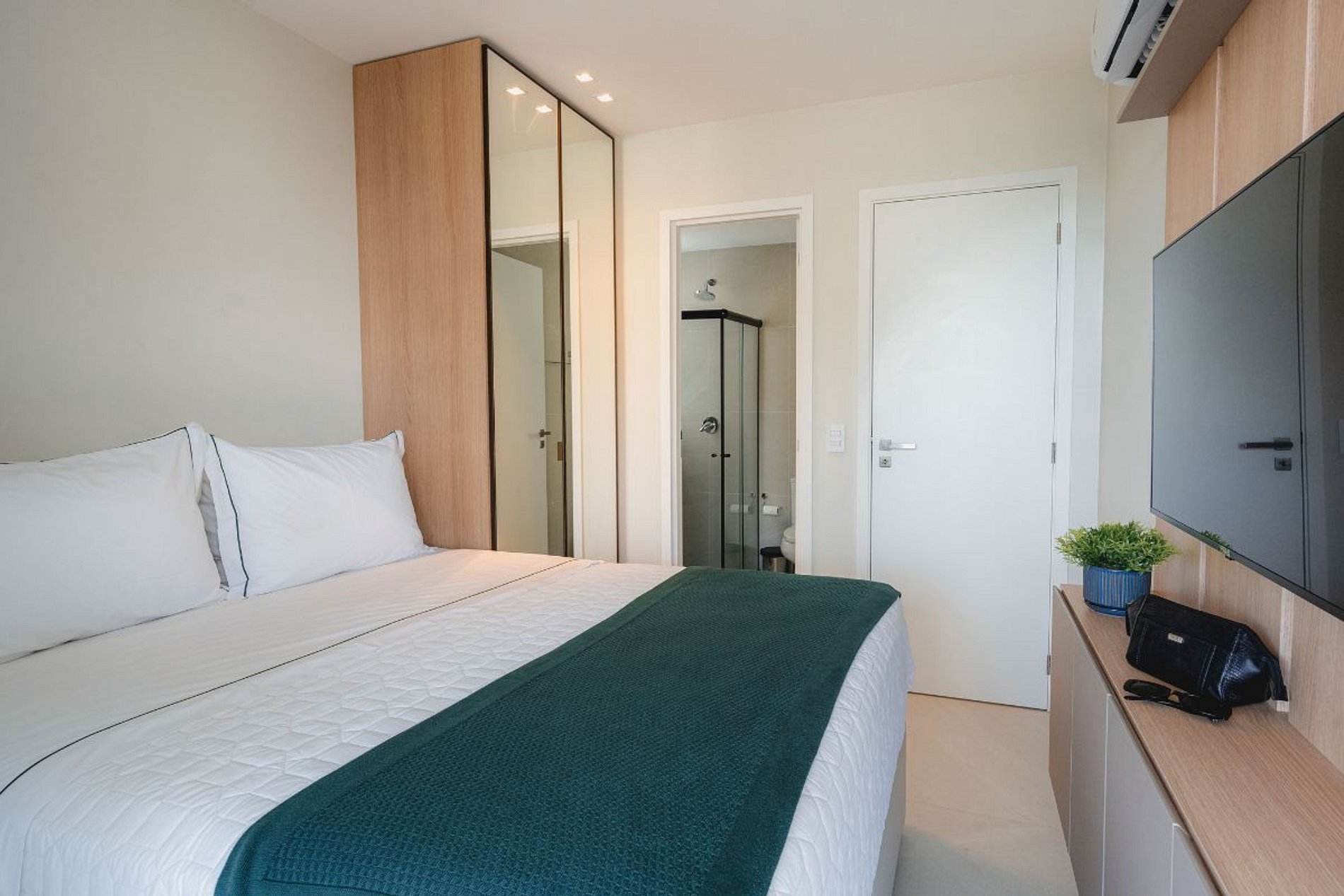- Cama queen size com colchão confortável e roupas de cama de alto padrão;