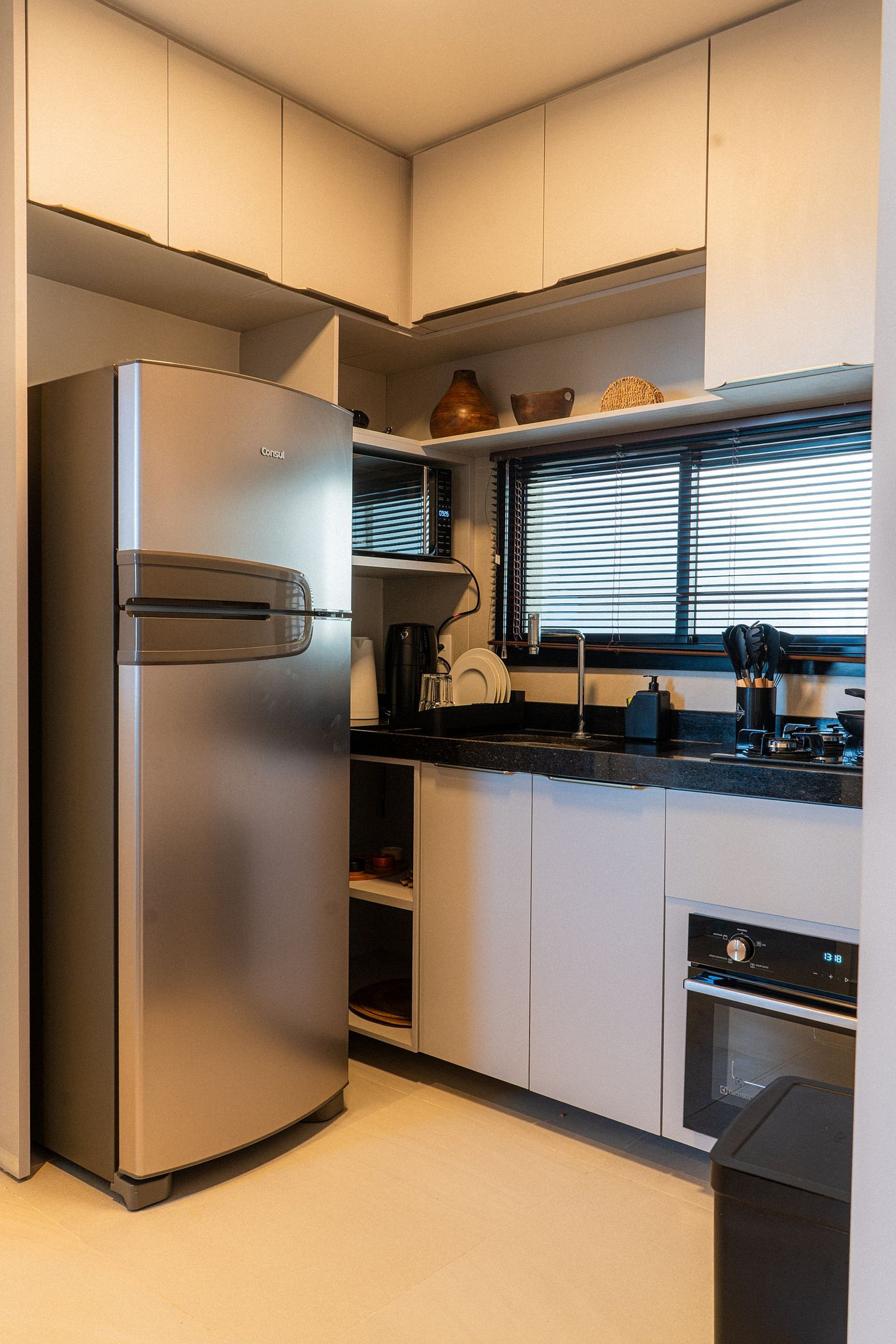 - Cozinha totalmente equipada, com fogão, micro-ondas, forno elétrico, geladeira e utensílios essenciais;