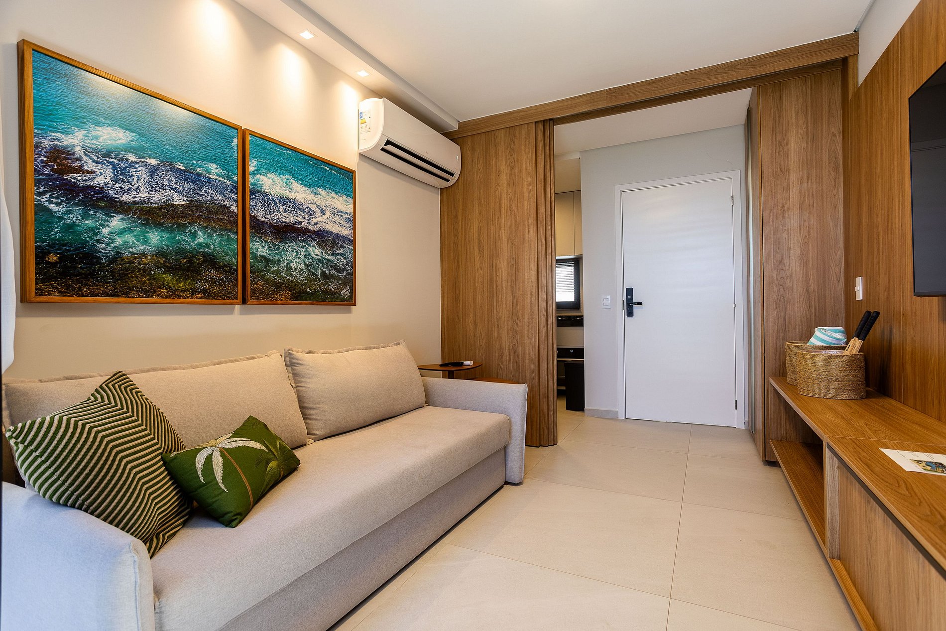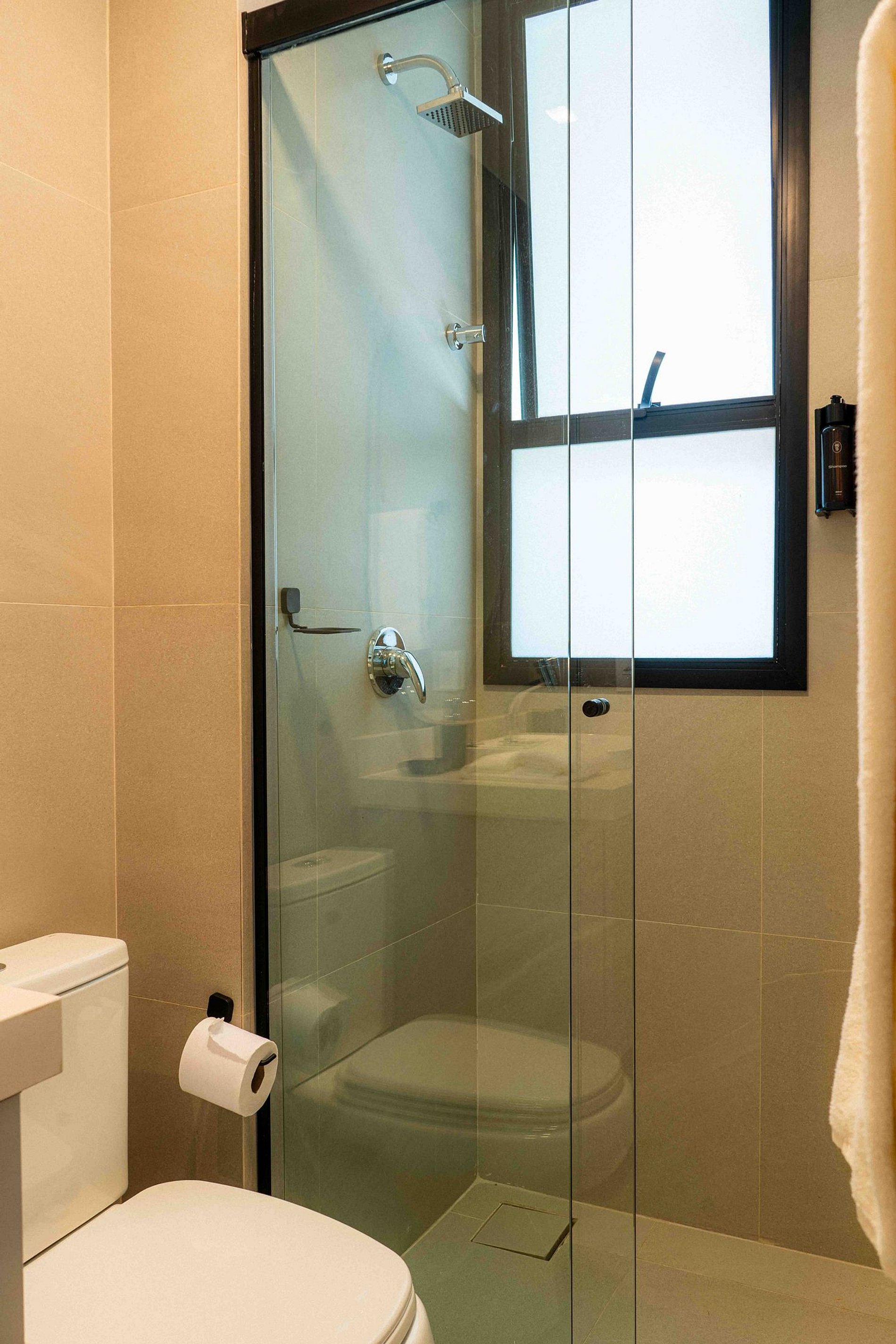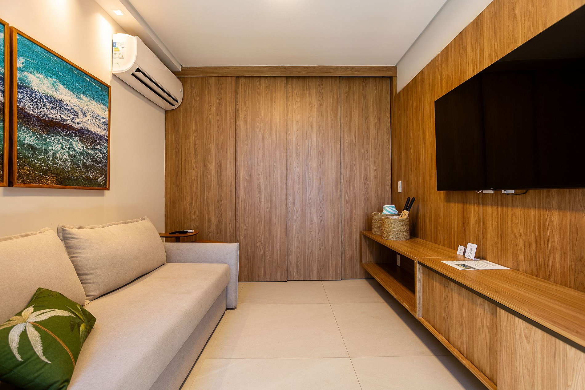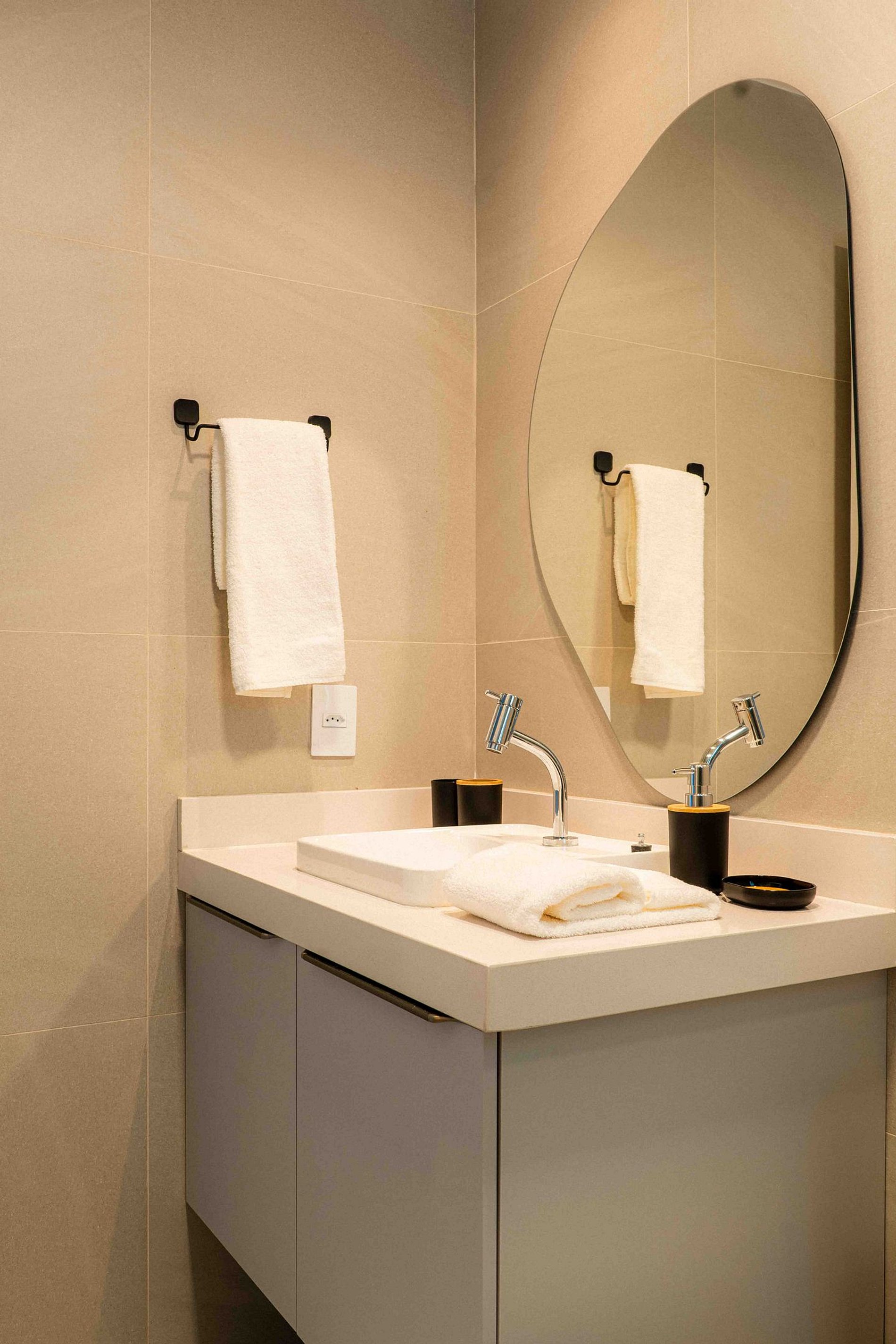 No quarto, uma cama queen-size extremamente confortável e um enxoval de alto padrão criam o ambiente ideal para noites de descanso perfeitas. O banheiro, moderno e elegante, conta com móveis planejados e acabamento impecável.
