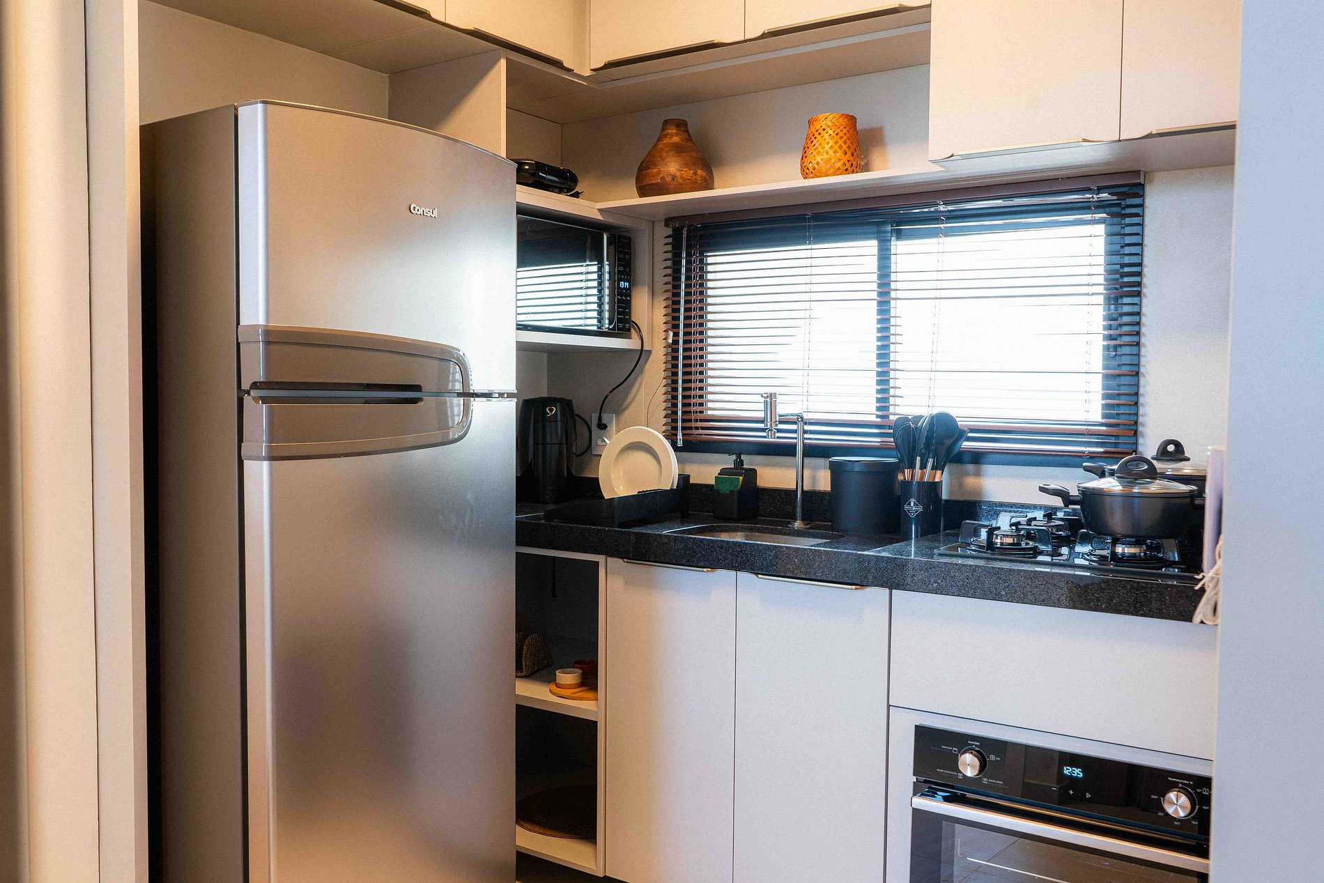 A cozinha é um charme à parte — totalmente equipada com eletrodomésticos de qualidade e utensílios essenciais, une praticidade e estilo para quem gosta de se sentir em casa mesmo longe dela.