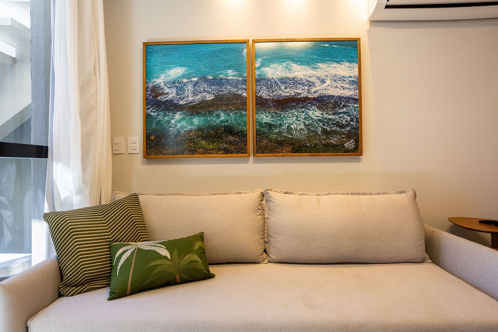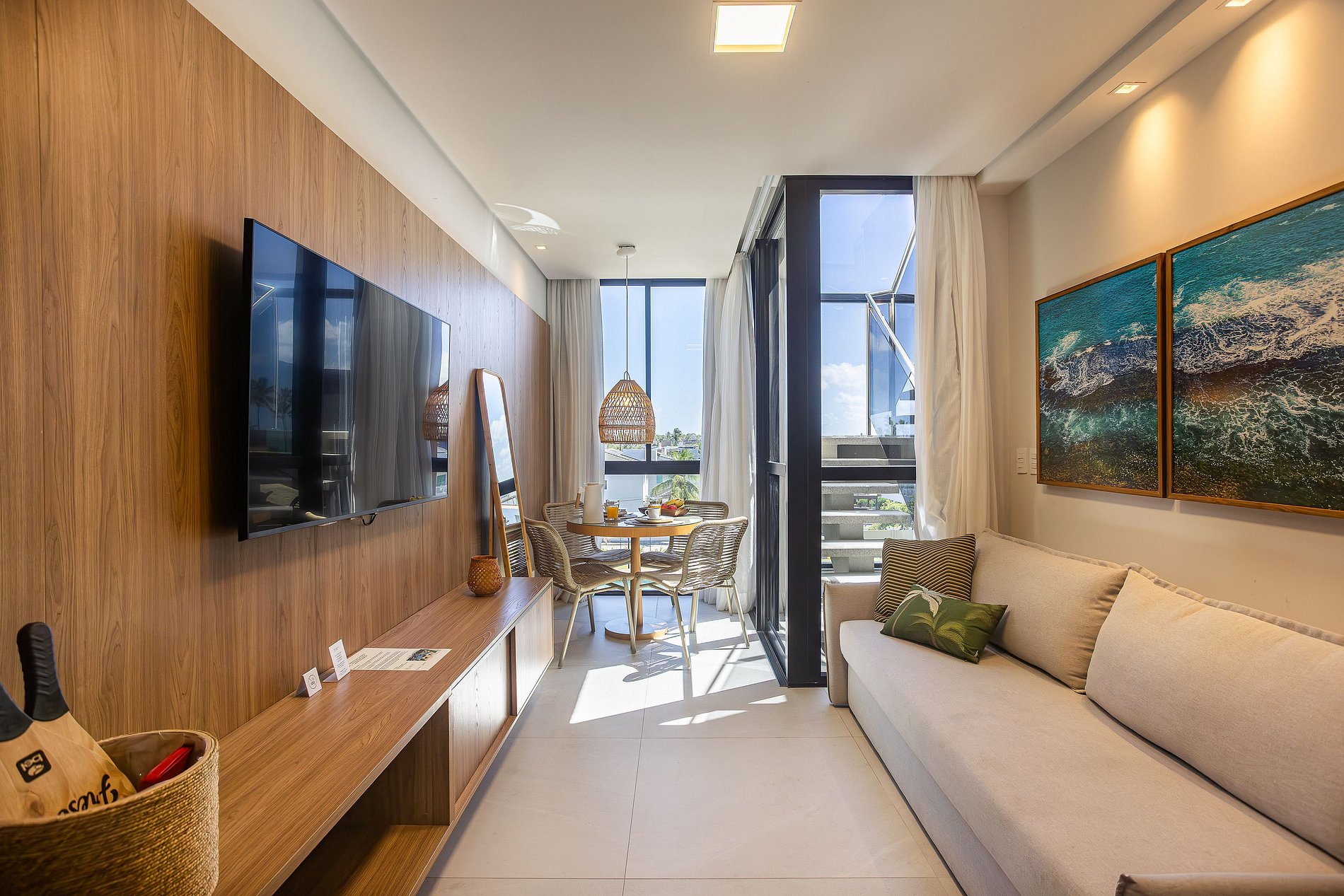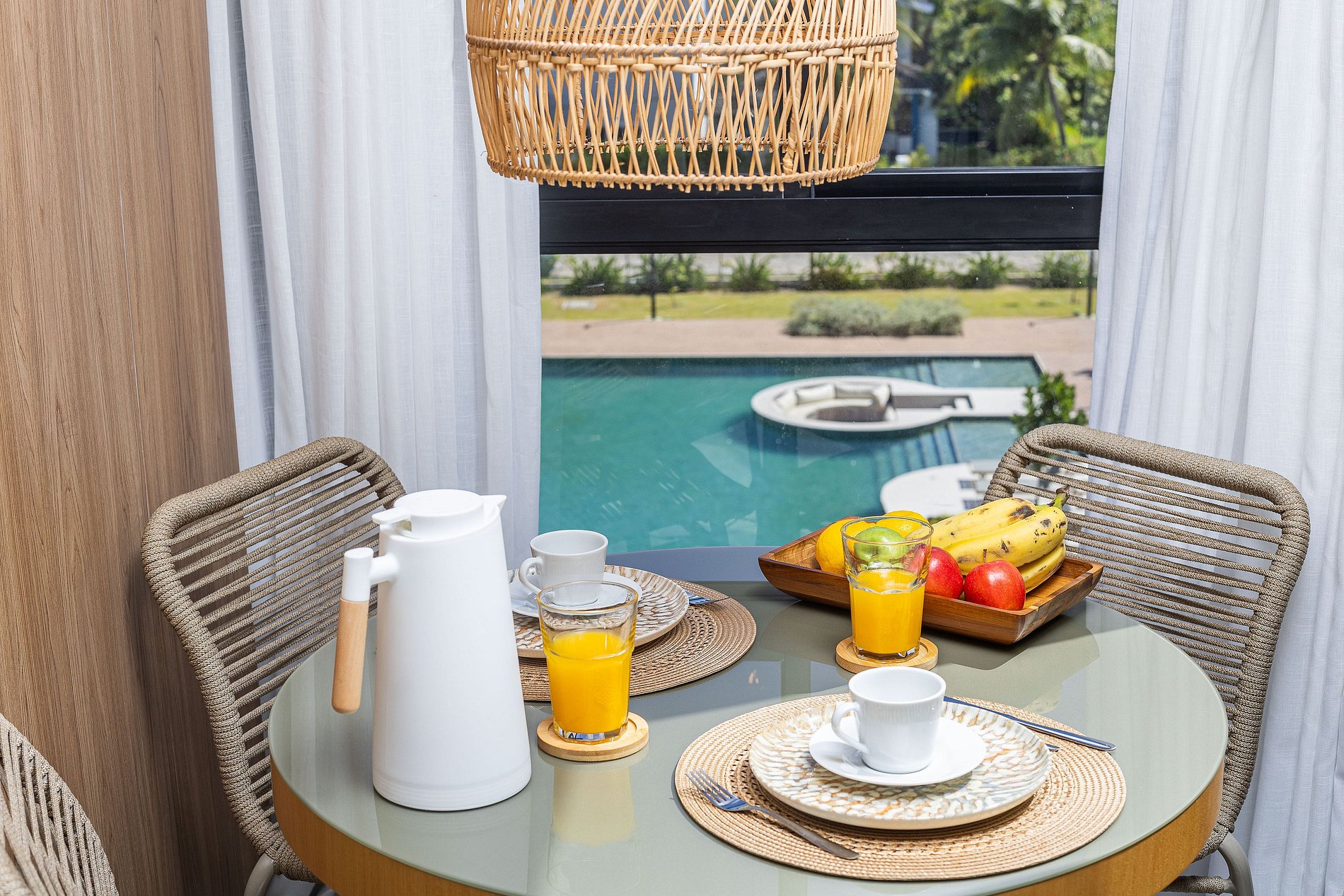 Encantadora em cada detalhe, a sala é banhada por luz natural que entra suavemente pelas amplas janelas, emoldurando uma vista repleta de palmeiras e céu azul — um cenário perfeito para relaxar ou saborear uma refeição leve.