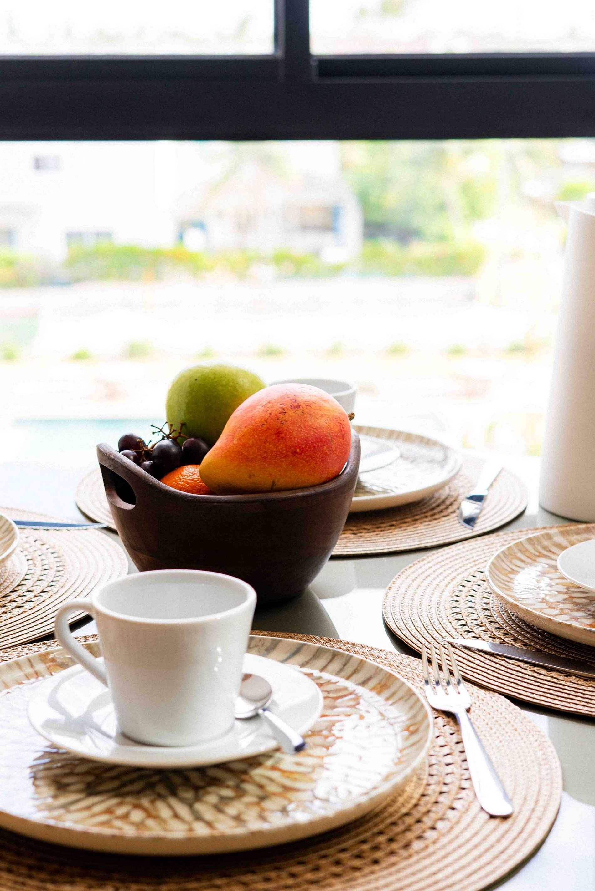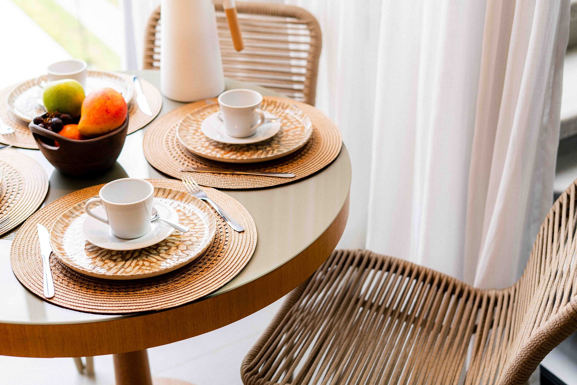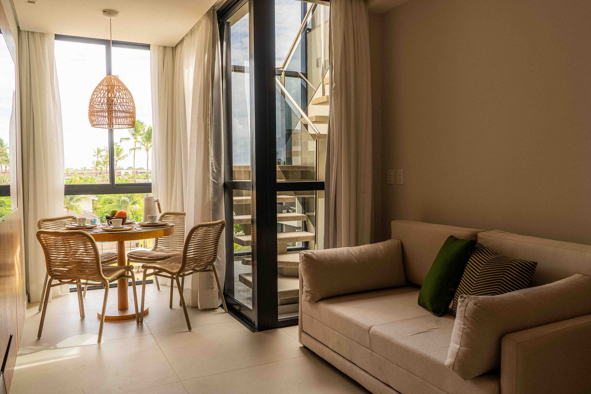 Encantadora em cada detalhe, a sala é banhada por luz natural que entra suavemente pelas amplas janelas, emoldurando uma vista repleta de palmeiras e céu azul — um cenário perfeito para relaxar ou saborear uma refeição leve.