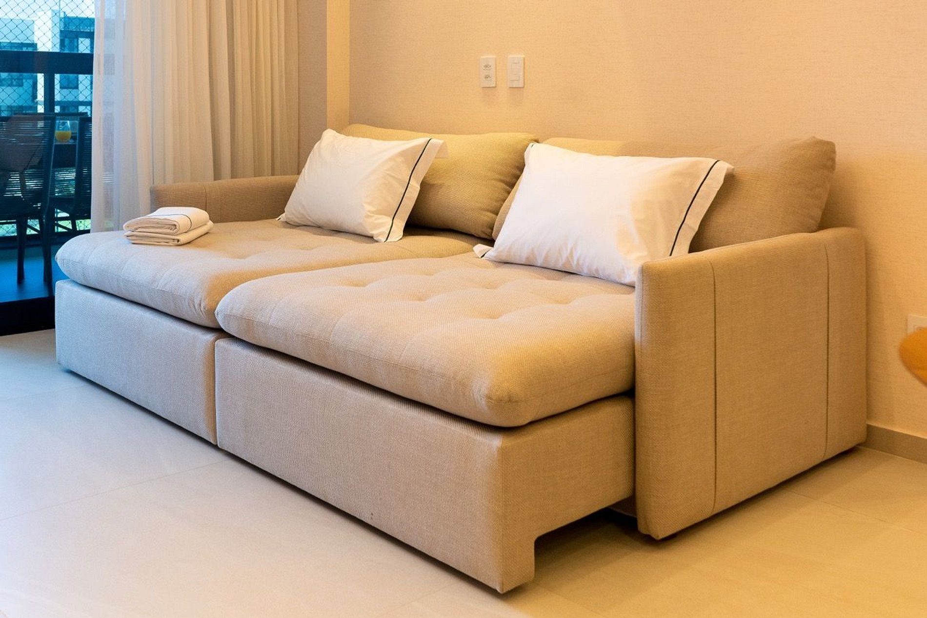 Imagine um lugar onde o luxo encontra a praticidade. Este apartamento de 2 suítes exclusivas foi pensado para o seu conforto. A sala de estar se adapta facilmente, transformando-se em um aconchegante dormitório extra, ideal para famílias ou grupos de amigos.