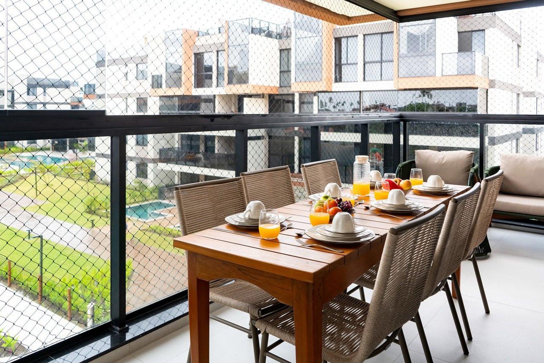 A varanda gourmet é um destaque à parte: nascente, super ventilada e com o sol apenas pela manhã, garante frescor e bem-estar durante toda a estadia. Equipada com churrasqueira acoplada, mesa para 6 pessoas e também protegida com telas, é perfeita para reunir a família em jantares especiais acompanhados de um bom vinho.