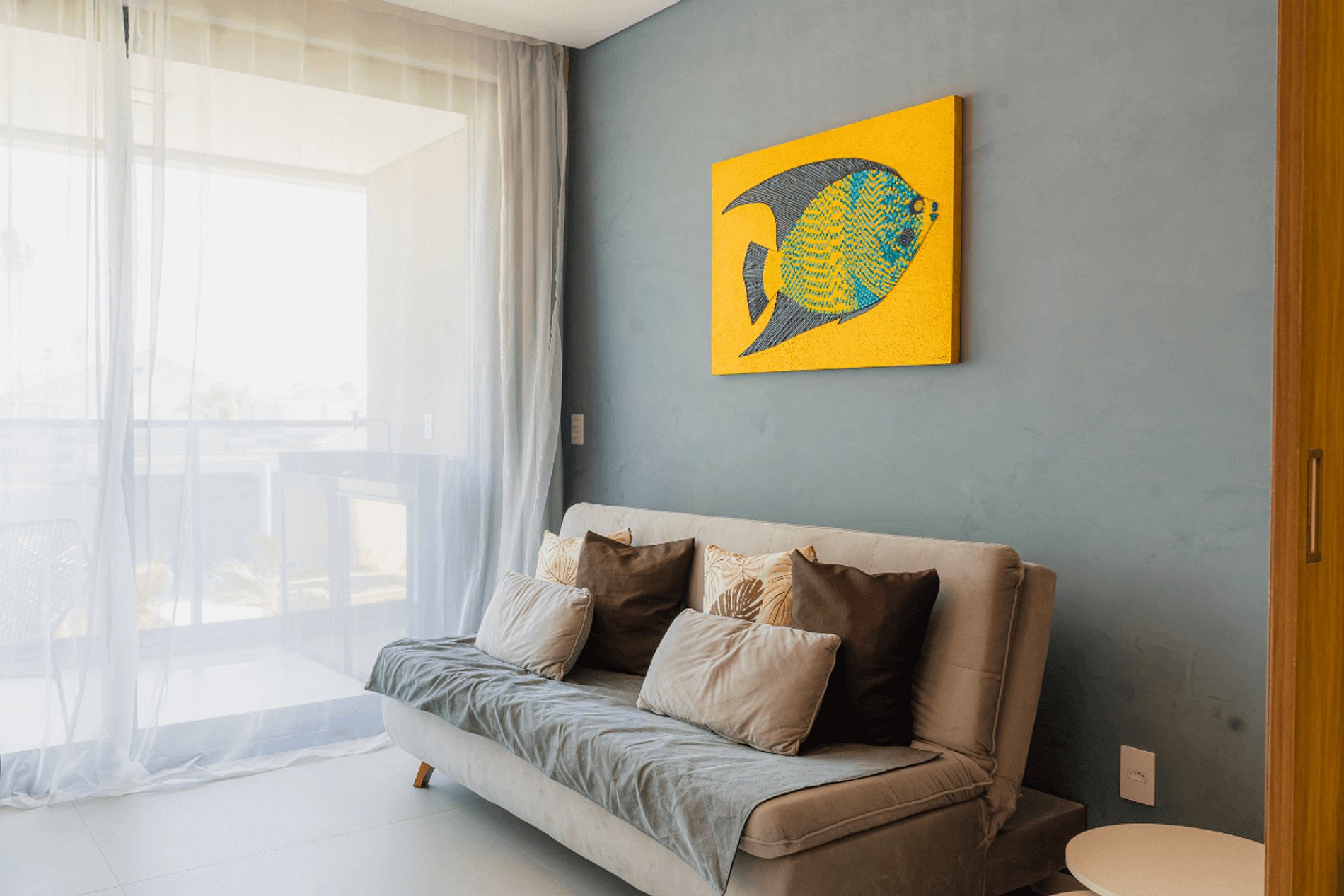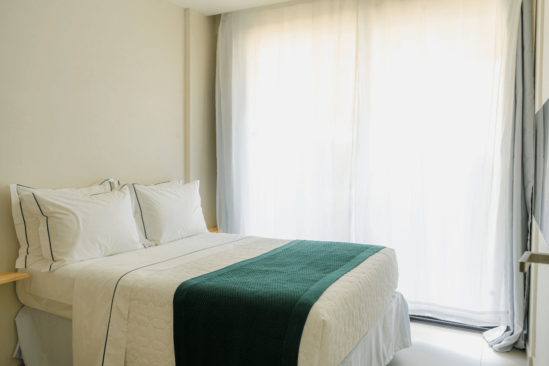 Os móveis planejados nos banheiros, cozinha e varanda trazem praticidade e um toque de requinte, enquanto o enxoval premium reforça a sensação de acolhimento em cada ambiente.