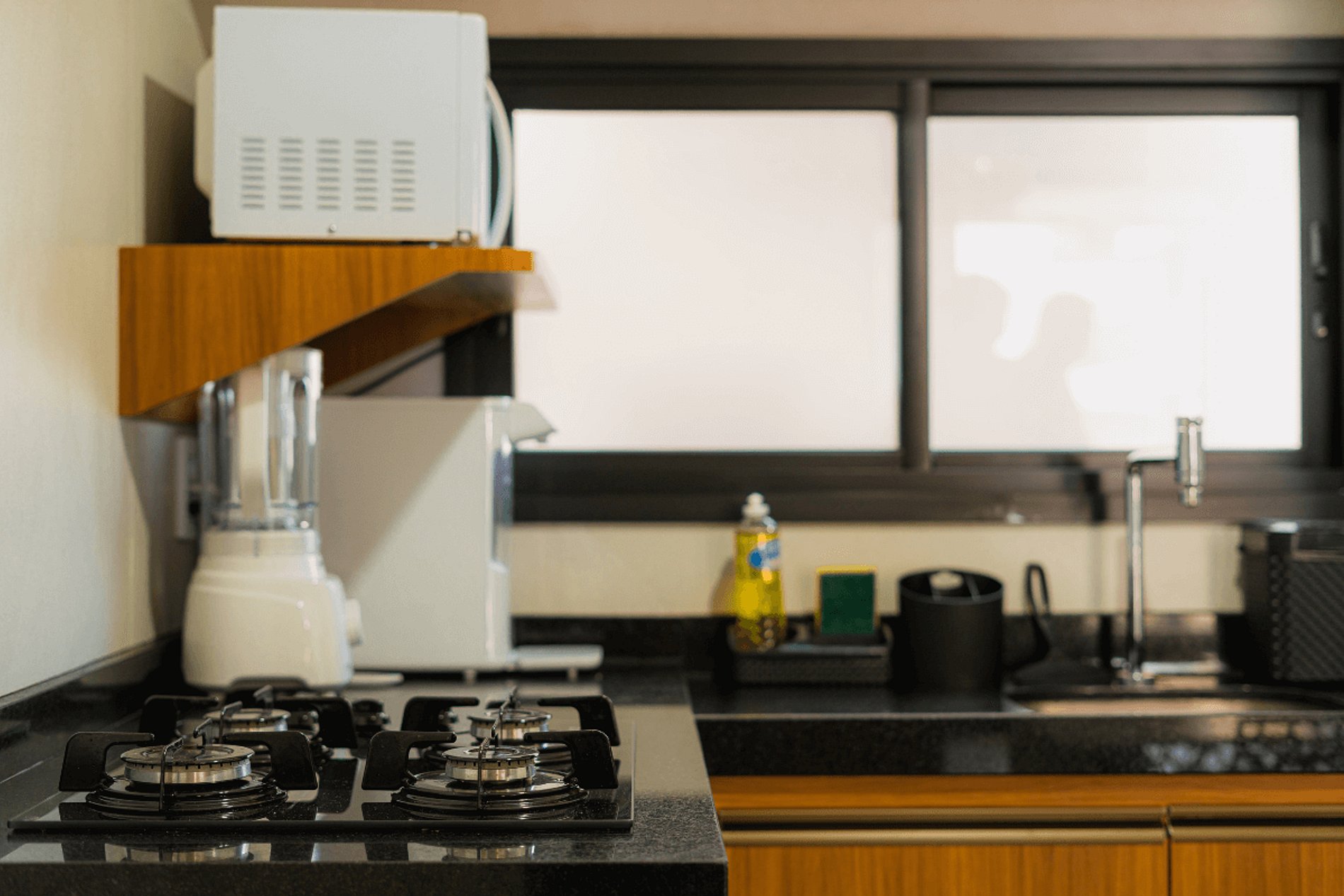 - Cozinha totalmente equipada, com fogão, micro-ondas, forno elétrico, geladeira e utensílios essenciais;